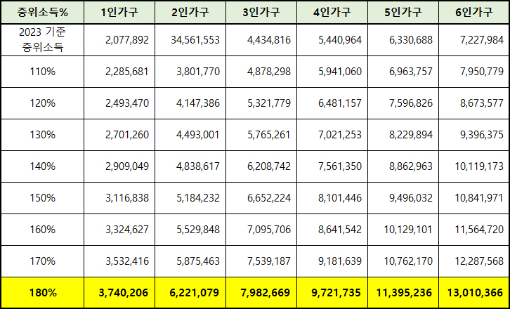 그래서 중위소득별 가구별로 한눈에 보기 쉽게 정리했습니다.